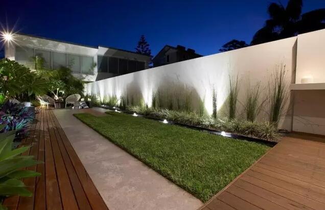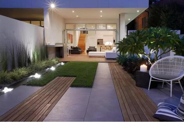 在原來一片空白的后院里創(chuàng)造了一個(gè)綠色庭院空間,出口以木平臺(tái)延伸室內(nèi)空間,緊靠圍墻設(shè)計(jì)了一個(gè)洗手臺(tái);后院以木材、石材、草和水景為基本元素,花園端頭形成一個(gè)小小的室外平臺(tái)